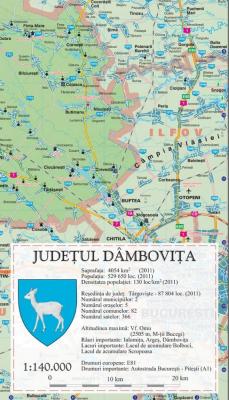 Harta de perete a judetului Dambovita cu datele de contact a tuturor primariilor din judet. Aceasta harta cuprinde informatii administrative, fizico-geografice si rutiere. Harta a fost realizata de un colectiv de cartografi profesionisti si a fost verificata in prealabil de catre institutiile abilitate din acest domeniu.