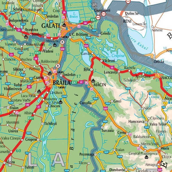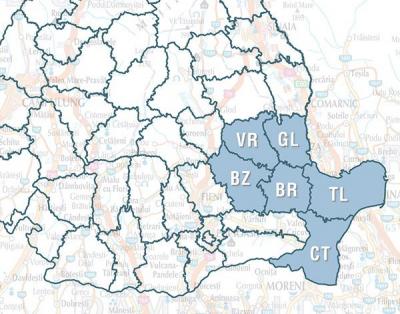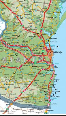Harta Regiunii de Sud-Est a Romaniei este o harta rutiera care cuprinde informatii la nivel de comune, sate. Regiunea Sud-Est cuprinde urmatoarele judete: Vrancea, Galati, Buzau, Braila, Tulcea si Constanta.