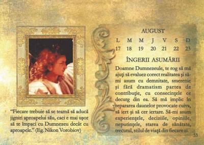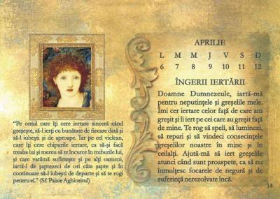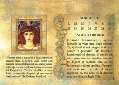 Prin intermediul acestui calendar, ii invitam pe ingeri sa participe impreuna cu noi la implinirea fiecarei zile. Prin rugaciune le solicitam prezenta, iar partea noastra de dumnezeire absoarbe vibratiile divine specifice pe care diferiti ingeri le aduc in fiecare saptamana. Prin unii dintre ei primim alinare, prin altii lumina, incredere, bucurie, fericire, iubire, bunatate, liniste sau rabdare.