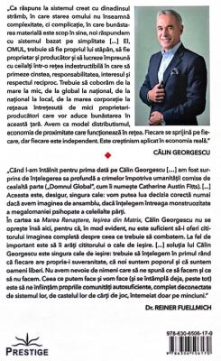 In cartea sa Marea Renastere, Iesirea din Matrix, Calin Georgescu nu se opreste insa aici, pentru ca, in mod evident, nu este suficient sa-i oferi cititorului imaginea completa despre ceea ce trebuie sa combatem. La fel de important este sa ii arati cititorului o cale de iesire. [...] solutia lui Calin Georgescu este singura cale de iesire: trebuie sa intelegem in primul rand ca fiecare dintre noi are propria-i suveranitate, ca noi suntem poporul si ca suntem oameni liberi. Nu avem nevoie de nimeni care sa ne spuna ce sa facem si ce sa nu facem. Ceea ce putem face si vom face (si se intampla deja, peste tot) este sa ne infiintam propriile noastre comunitati autosuficiente, complet deconectate de sistemul lor, de castelul lor de carti de joc, intemeiat doar pe minciuni."