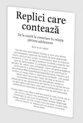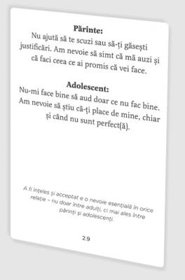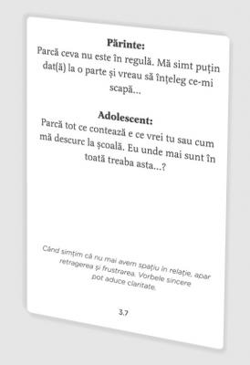 Fiecare card contine un mesaj-cheie, o „replica ce conteaza“, care poate deveni acel instrument magic de care ai nevoie in momentele tensionate sau delicate din relatia cu adolescentul sau adolescenta din familia ta. In partea de sus vei gasi replica parintelui, apoi replica adolescentului, iar in partea de jos explicatia si cateva note de psihoeducatie.
