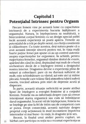 Aceasta, cea de-a doua mea carte despre tantra, exploreaza in esenta tantra dintr-o perspectiva feminina. in paginile ce urmeaza, incerc sa transmit rolul semnificativ pe care energia feminina receptiva il joaca in schimbul sexual dintre barbat si femeie. Nu ar fi realist sa trasam o linie distincta intre femeie si barbat atunci cand vorbim despre sex, deoarece sexul este cea mai intima intalnire dintre elementele masculine si feminine. Cu toate acestea, exista aspecte ale sexualitatii care se aplica exclusiv femeilor, si acestea pot fi folosite cu un avantaj distinct pentru a influenta si a intari experienta sexuala - atat pentru femei, cat si pentru barbati. O femeie care nu are un partener poate totusi sa beneficieze de aceste cunostinte. Acestea ii pot oferi o noua perceptie despre ea Insasi si despre corpul ei, iar adesea, prin aceasta noua constientizare, isi va atrage partenerul potrivit.