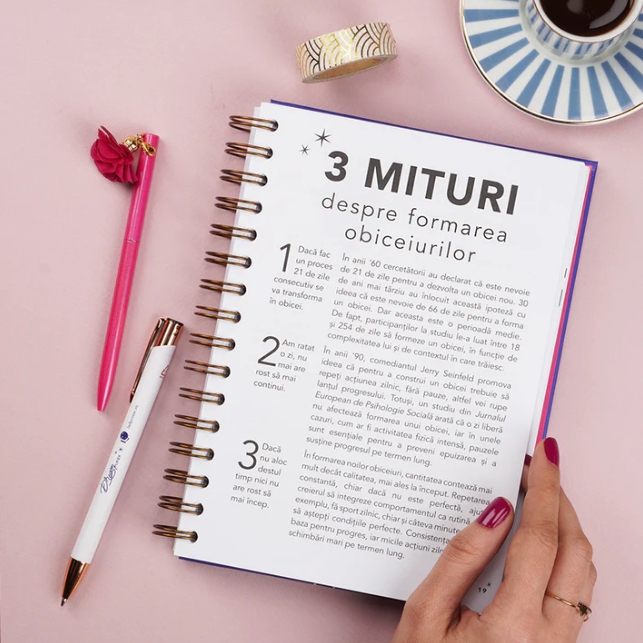 Acest planner unic este mai mult decat un instrument de organizare – este ghidul tau personal pentru a intelege cum functioneaza creierul, cum se formeaza obiceiurile si cum poti construi o punte intre visurile tale si actiunile zilnice.