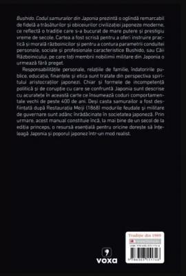 Bushido. Codul samurailor din Japonia prezinta o oglinda remarcabil de fidela a trasaturilor si obiceiurilor civilizatiei japoneze moderne, ce reflecta o traditie care s-a bucurat de mare putere si prestigiu vreme de secole. Cartea a fost scrisa pentru a oferi instruire practica si morala razboinicilor si pentru a contura parametrii conduitei personale, sociale si profesionale caracteristice Bushido, sau Caii Razboinicului, pe care toti membrii nobilimii militare din Japonia o urmeaza fara preget.
