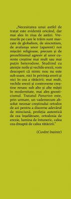 „Caci trebuie sa fie intre voi si eresuri, ca sa se invedereze intre voi cei incercati” (1 Corinteni 11, 19). Afirmatia raspicata a Sfantului Apostol Pavel ne deruteaza. Sunt sectele, ereziile si schismele o necesitate? Sa fie acesta destinul oricarei religii in general, iar al crestinismului in special? A existat o vreme cand omenirea se afla in armonie si pace, cand nu existau controverse, polemici, galcevi, schisme, opinii contrare, dezbinari? Este crestinismul o alta „opinie” moral-filozofica despre Dumnezeu, adaugata celor care il asaltau pe omul antic de acum 2000 de ani, cu oferte care mai de care mai seducatoare? Intrebarile de mai sus sunt legitime, iar raspunsuri limpezi si ferme au fost oferite de multa vreme de catre Sfintii Parinti ai Bisericii crestine. O sinteza a acestor raspunsuri ne este infatisata de monumentala opera Panarion (Impotriva tuturor ereziilor) a Sfantului Epifanie de Salamina, cel mai important si cuprinzator tratat patristic de expunere si combatere a ereziilor, mai exact 80 de erezii cu care s-a confruntat crestinismul in primele patru secole. In acest prim volum, prezentam cititorilor romani primele 53 de erezii, care au pus la grea incercare Biserica veche, care insa a triumfat asupra lor.