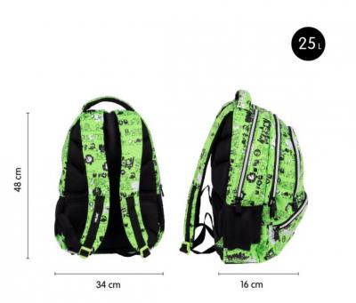 Acest ghiozdan MILAN face parte din seria speciala Tandem 2, unde personaje diverse, de la dinozauri si extraterestri pana la croissante si oua amuzante, colaboreaza si merg impreuna in aceeasi directie. Designul modern combina imprimeuri alb-negru pe un fundal verde vibrant, oferind un aspect deosebit si plin de personalitate.