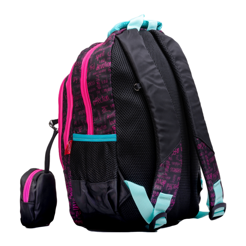 Ghiozdanul este prevazut cu patru fermoare si o borseta practica pentru a depozita obiecte mici. Baretele sunt reglabile pentru a oferi un confort maxim la purtare si sunt prevazute cu burete si plasa, pentru a preveni transpiratia.