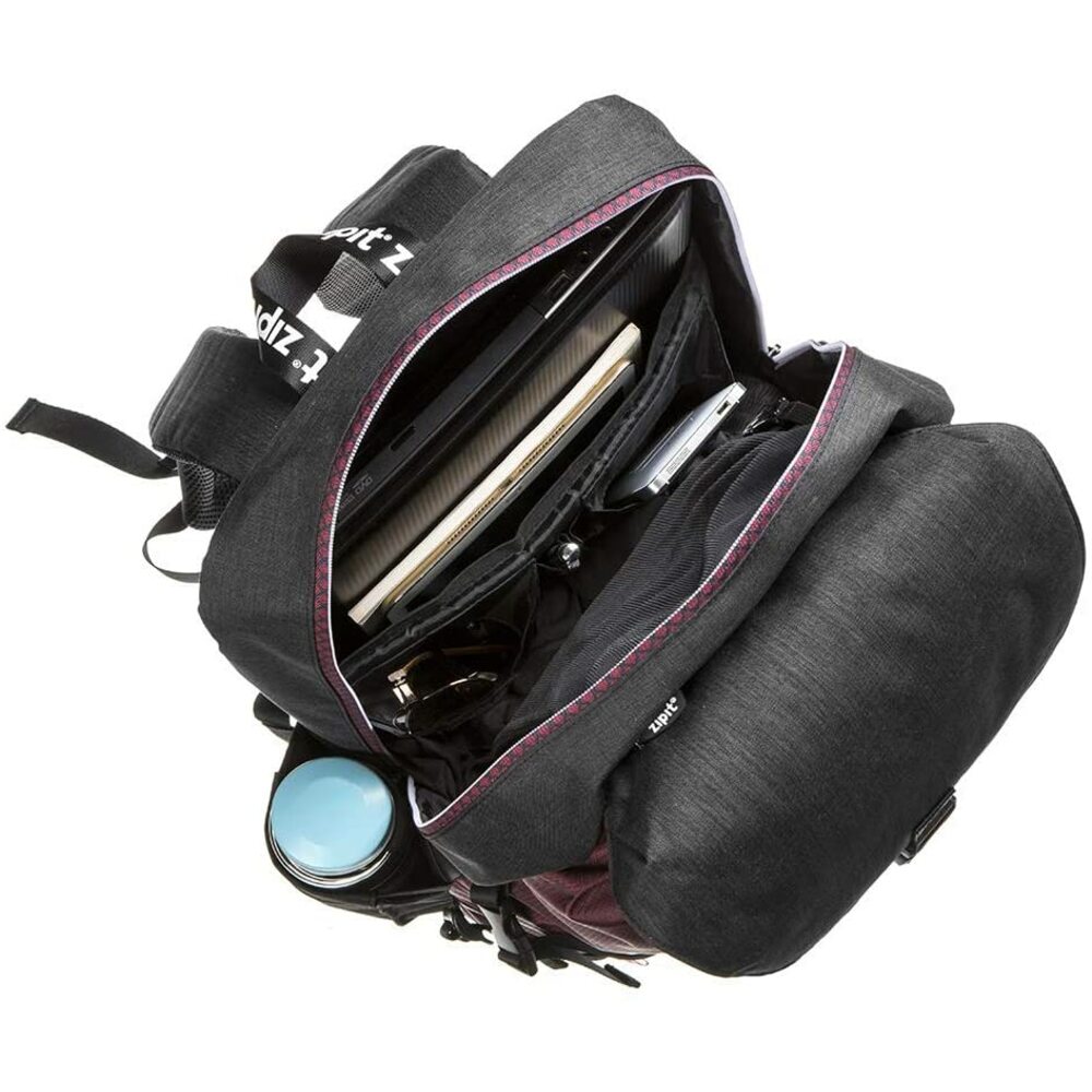 Rucsacul are doua compartimente mari pentru carti si caiete, buzunare multiple pentru organizarea obiectelor mici si buzunare cu fermoar pentru telefon si laptop.