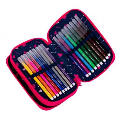Penarul cu model "Inimioare" de la DACO este un accesoriu frumos si practic, conceput pentru a va ajuta sa va pastrati stiloul, creioanele, markerele si alte obiecte de papetarie organizate. Este prevazut cu doua compartimente principale, fiecare cu propriul sau fermoar, oferind o separare eficienta a continutului.