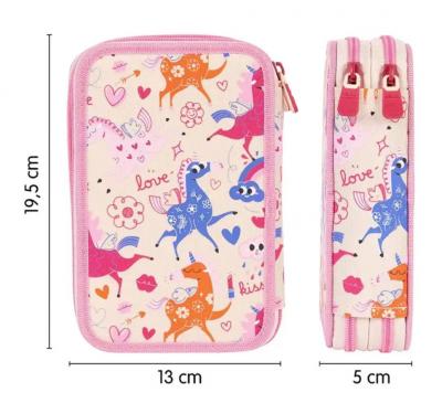 Caracteristici produs - Colectie: Flowicorn - Tip produs: penar echipat dublu (double-decker) - Compartimente: 2 - Material: poliester - Dimensiuni: 19,5 x 13 x 5 cm - Culoare: bej, cu imprimeu Flowicorn (unicorni, flori, inimioare)