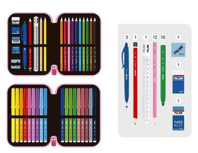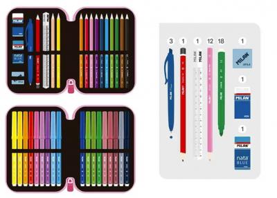 Continut penar - 2 radiere: MILAN 4024 si Nata Blue - 1 ascutitoare Afila - 1 creion grafit HB hexagonal - 1 pix P1 albastru - 1 rigla triunghiulara 15 cm - 12 creioane colorate triunghiulare - 18 carioci cu varf conic