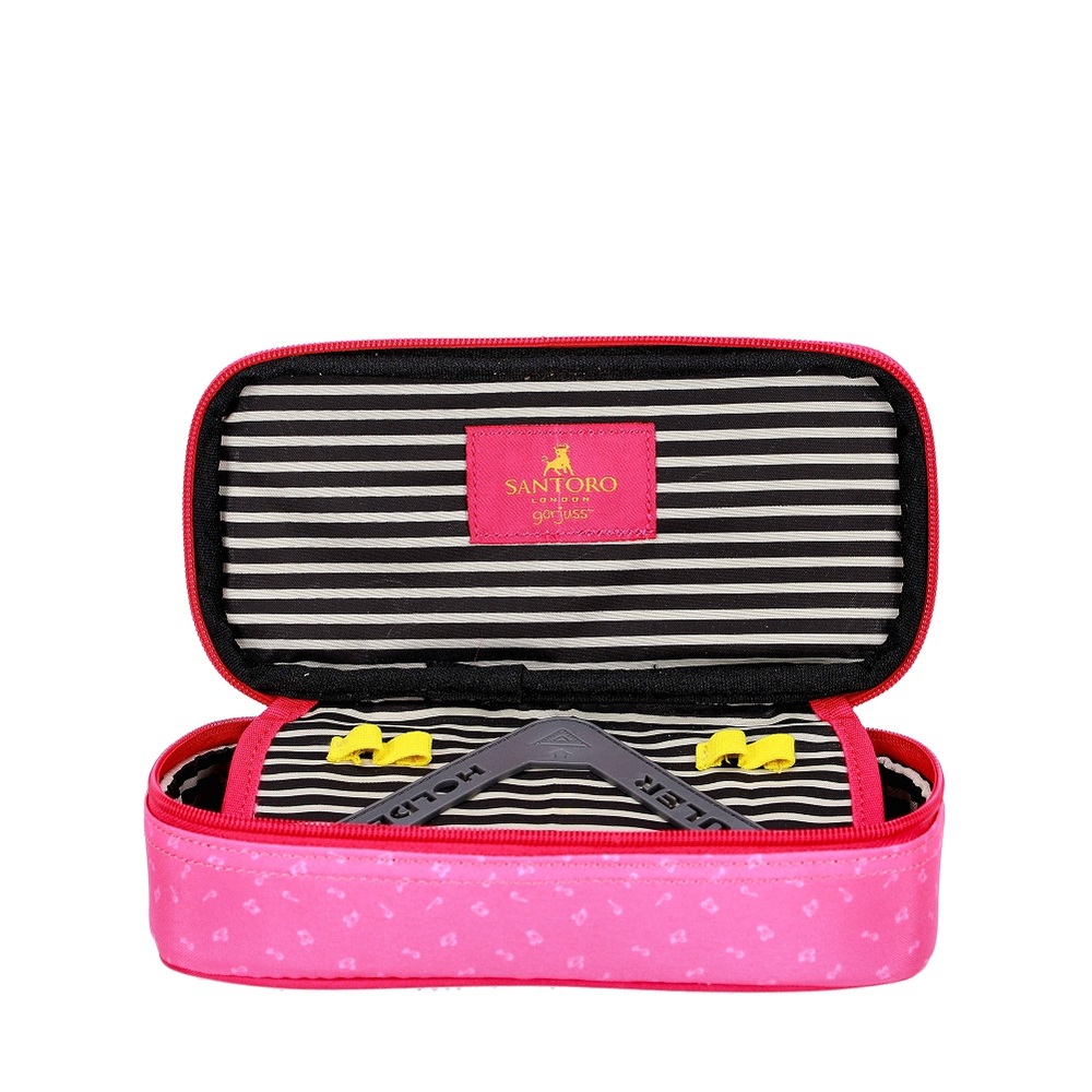 In interior este prevazut cu 12 elastice pentru instrumentele de scris, un buzunar interio si suport pentru rigla.