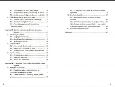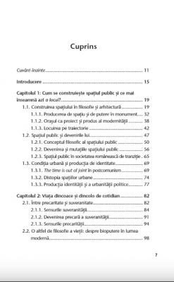 Cu o superba stapanire a subiectelor, intr-un limbaj in acelasi timp accesibil si suplu, Ciprian Mihali realizeaza o incitanta introducere in filosofia sociala cu teme de interes pentru societatea romaneasca de azi. Autorul ne poarta, prin spatiul construit (fizic) de arhitecti si (conceptual) de filosofi, de la biopolitica si reprezentanti emblematici ai filosofiei franceze contemporane (Foucault, Lyotard, Derrida, Nancy) la precaritatea conditiei umane individuale, de la suveranitate la drepturile omului, culminand cu reconfigurarea filosofiei sociale in epoca digitala.