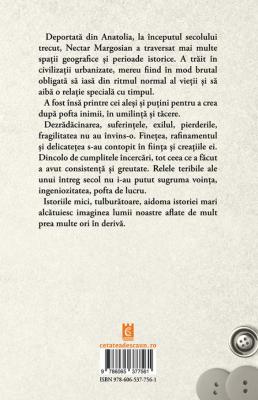 Deportata din Anatolia, la inceputul secolului trecut, Nectar Margosian a traversat mai multe spatii geografice si perioade istorice. A trait in civilizatii urbanizate, mereu fiind in mod brutal obligata sa iasa din ritmul normal al vietii si sa aiba o relatie speciala cu timpul. A fost insa printre cei alesi si putini pentru a crea dupa pofta inimii, in umilinta si tacere. Dezradacinarea, suferintele, exilul, pierderile, fragilitatea nu au invins-o. Finetea, rafinamentul si delicatetea s-au contopit in fiinta si creatiile ei. Dincolo de cumplitele incercari, tot ceea ce a facut a avut consistenta si greutate. Relele teribile ale unui intreg secol nu i-au putut sugruma vointa, ingeniozitatea, pofta de lucru. Istoriile mici, tulburatoare, aidoma istoriei mari alcatuiesc imaginea lumii noastre aflate de mult prea multe ori in deriva.